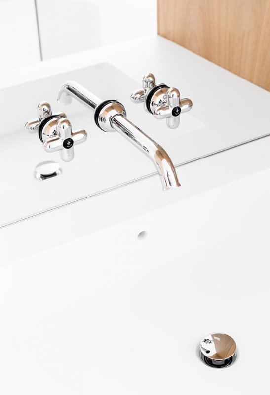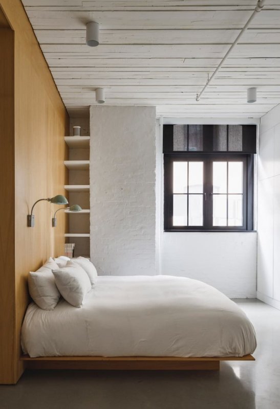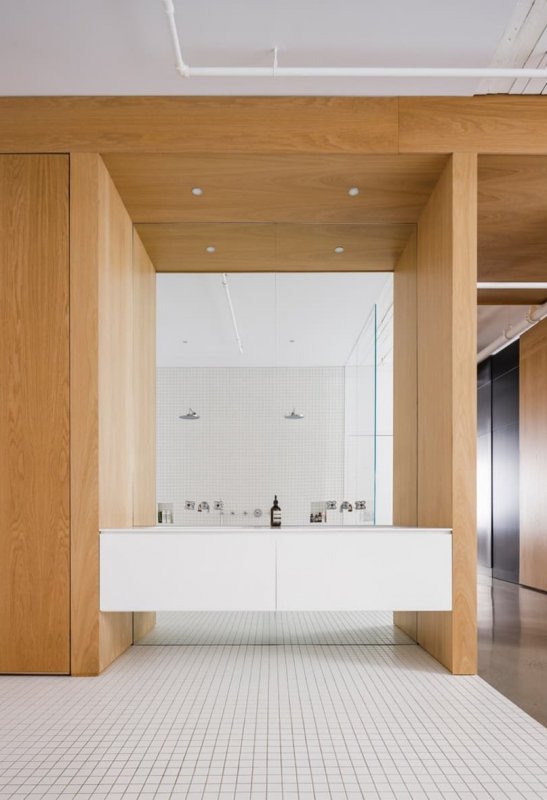 В квартиру можно попасть на старом грузовом лифте. Шкафы вокруг него, в том числе массивная книжная полка и складские помещения, оформлены черным цветом, контрастирующим с белыми кирпичными стенами и встроенными модулями из светлого дуба. Зонирование сделано с помощью деревянных шкафов, арок и полок, стеклянных перегородок и разных напольных покрытий. Это сохраняет изначальный простор помещения и наполняет его естественным светом. Особая изюминка проекта – огромная душевая на двоих с прозрачной стеклянной стеной между спальней. Не менее большая кухня оснащена длинным и широким деревянным островом. Текстура голых кирпичных стен сохранена, но белая краска придает им теплоты и уюта.