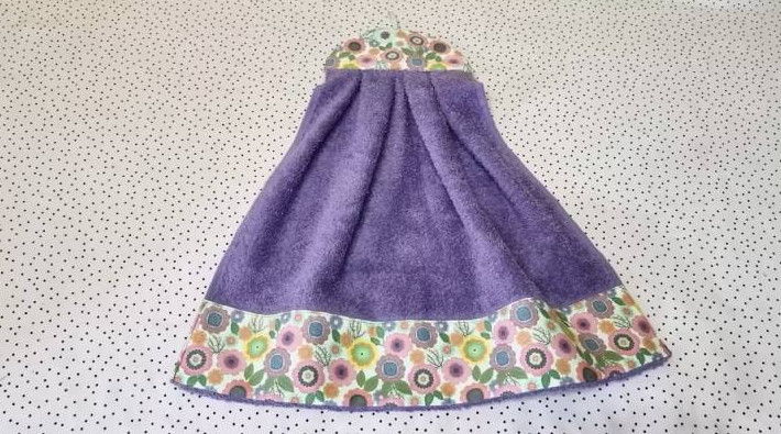 К полотенцу пришейте три петельки из ткани. Также из той же ткани вырежьте полосу и закройте срезанный край полотенца.