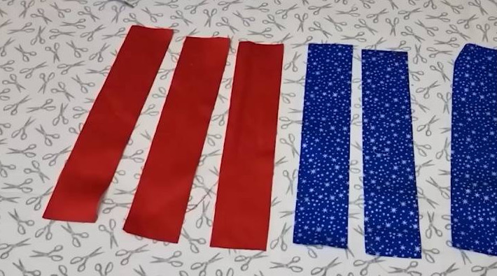 Для второй идеи подготовьте полотенце 33*70 см. Также разрежьте его на две равные части. Ещё понадобятся полоски ткани — 5*25 см, по 3 шт. на каждую половинку полотенца.