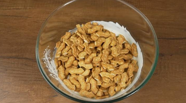 В миске соедините сметану 20 % и сахар, перемешайте. Всыпьте мелкий крекер (с маком — ещё вкуснее). По желанию добавьте мелко порезанный банан или любой другой фрукт/ягоды (консервированные).
