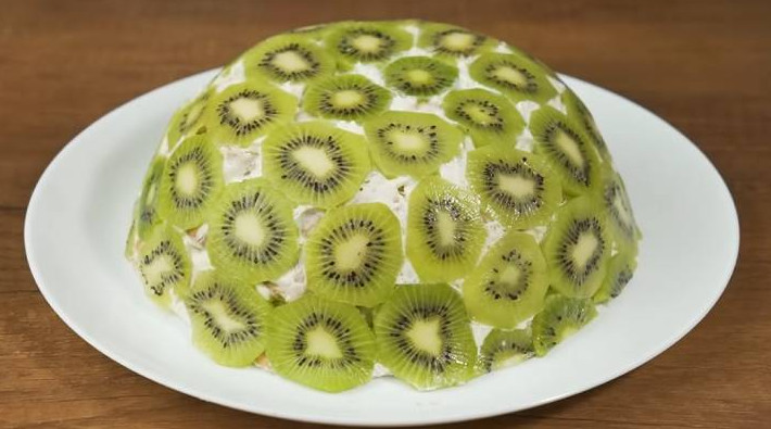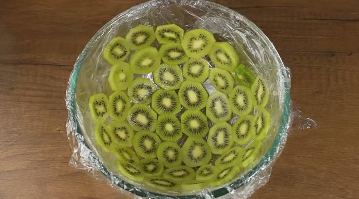 Глубокую круглую миску выстелите пищевой плёнкой. Киви почистите, тонко нарежьте. Выложите в один слой, заполняя всю миску.