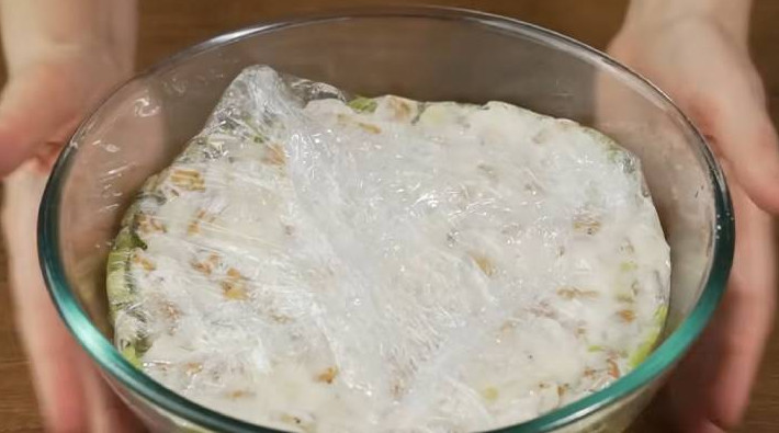 Отправьте в холодильник на пропитку минимум на 3 часа (рекомендовано — на ночь). После этого снимите плёнку сверху, переверните миску на плоское блюдо. Уберите плёнку.
