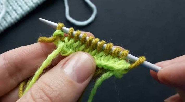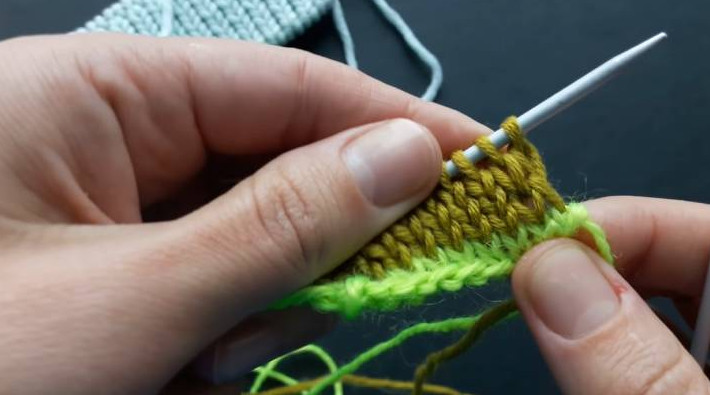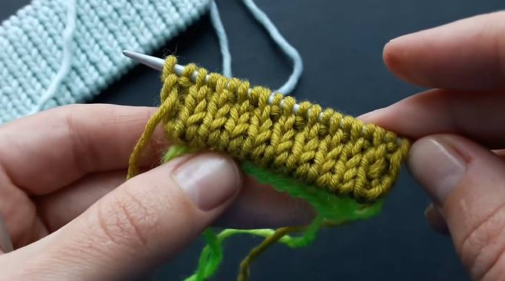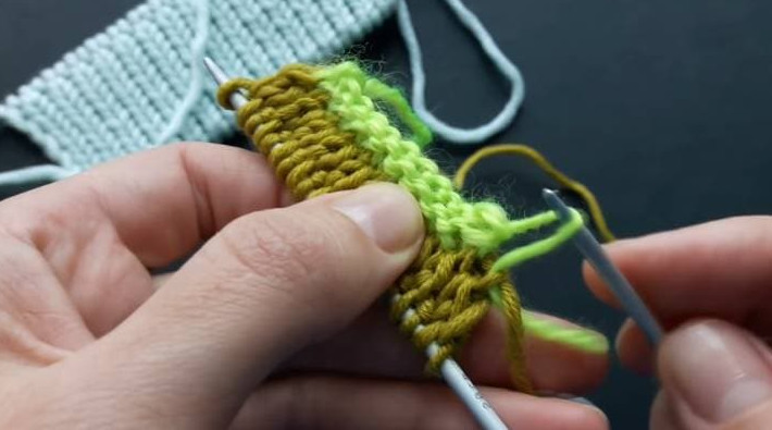 Теперь присоедините пряжу основного цвета изделия. Провяжите 1-й ряд лицевой гладью (все петли лицевые, кроме последней — изнаночной). 2-й ряд — первую снимите, все петли — изнаночные.