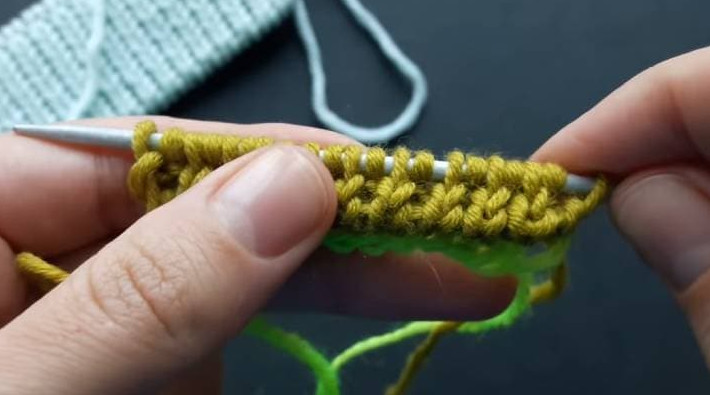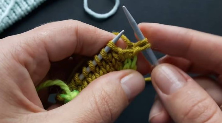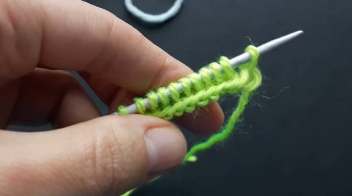Следующую петлю провяжите со спицы — лицевой. Далее снова подхватите петлю из первого ряда, накиньте на спицу и провяжите изнаночной. Затем снова со спицы — лицевой, и т. д.