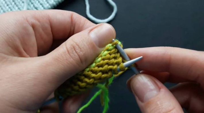 Возьмите любую контрастную пряжу подходящего размера. Наберите нечётное количество петель и свяжите всего 1 ряд: кромочную снимите, все петли — изнаночные.