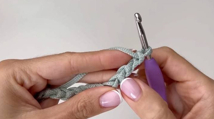 Пропустите 2 перемычки — это будет первый столбик. В 3-ю вяжите столбик с накидом (ССН). Таким образом, заполните всю цепочку. Когда дойдёте до конца, первоначальный узел распустите и в это отверстие провяжите 7 ССН, чтобы вязание повернулось на другую сторону. Там также провяжите по 1 ССН в каждую петлю. В конце, на повороте, провяжите 5 ССН в первую петлю. Присоединитесь соединительным столбиком (СС), поднимитесь на 1 столбик без накида (СБН) + 1 воздушную петлю (ВП).