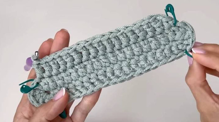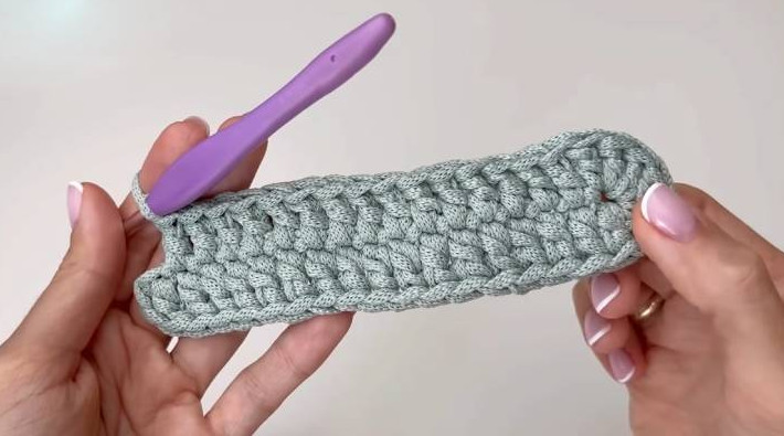 Двух рядов будет достаточно, чтобы ручки были крепкими и достаточно толстыми. Конец нити спрячьте в вязании.