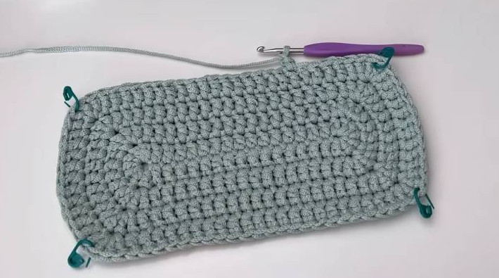 Поставьте маркеры в углах (повороты). В них вяжите по 4 ССН. После провязывания маркер переставляйте в середину между 4 дополнительными столбиками (то есть, между 2 и 2). По прямой вяжите, как обычно, по 1 ССН в каждую петлю.
