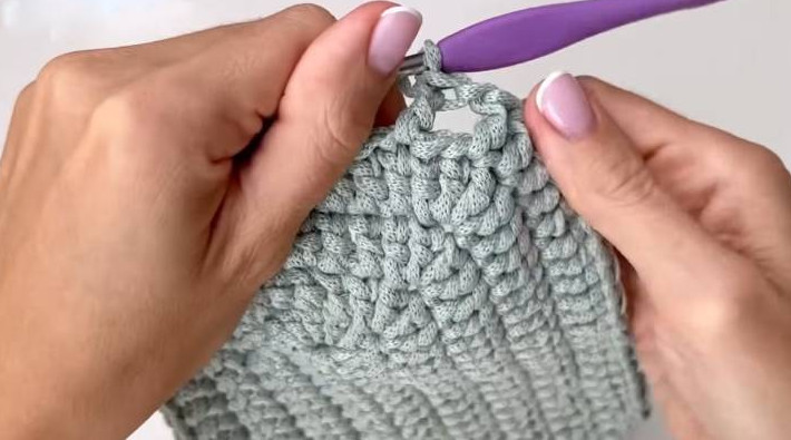 Дополнительных столбиков больше не нужно добавлять — теперь ряд за рядом вяжите, пока высота не начнёт вас устраивать. На каждый новый ряд переходите так, как было сказано выше: в конце ряда — соединительный столбик (СС) + подъём на 1 СБН + 1 ВП.