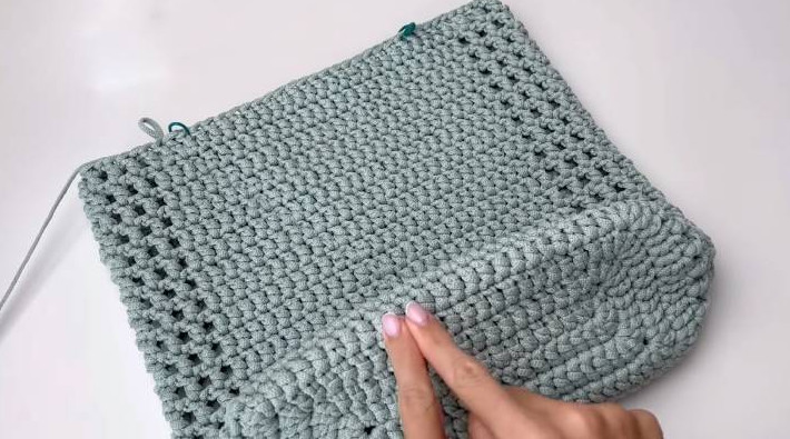 Таким образом, рисунок с ячейками формируется только по коротким сторонам прямоугольного дна — его ширине. Когда повернёте вязание на длинную сторону, просто вяжите ССН.