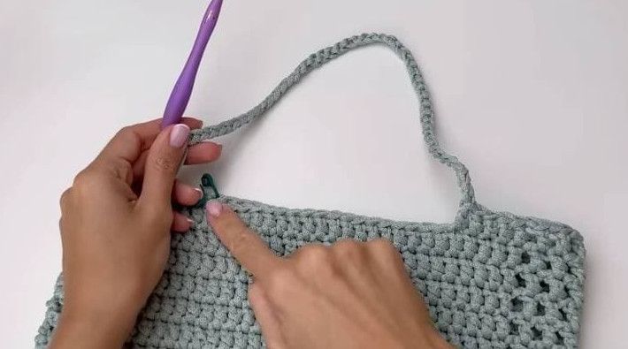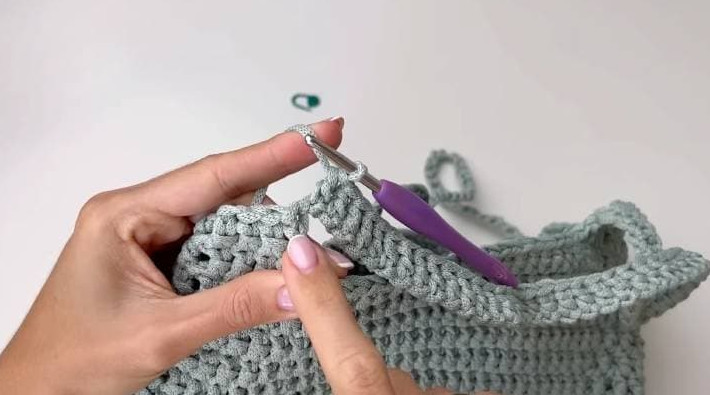 Теперь необходимо связать ручки. Поставьте маркеры на равном расстоянии с одной и другой стороны. Вяжите по рисунку, пока не дойдёте до первого маркера. Как только дошли — наберите цепочку из воздушных петель. Количество зависит от того, насколько длинные ручки вы хотите получить. В конце присоединитесь СБН ко второму маркеру. Далее вяжите по рисунку и с другой стороны сделайте то же самое.