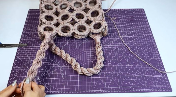 Теперь шнуры разделите напополам (по 8 шт.) и заверните вправо. После этого перекрутите две половинки между собой, но уже влево. Таким образом, получится красивая ручка! Доведите до противоположного крайнего кольца и с помощью второго шнура 60 см зафиксируйте. Аналогичным образом сделайте вторую ручку!