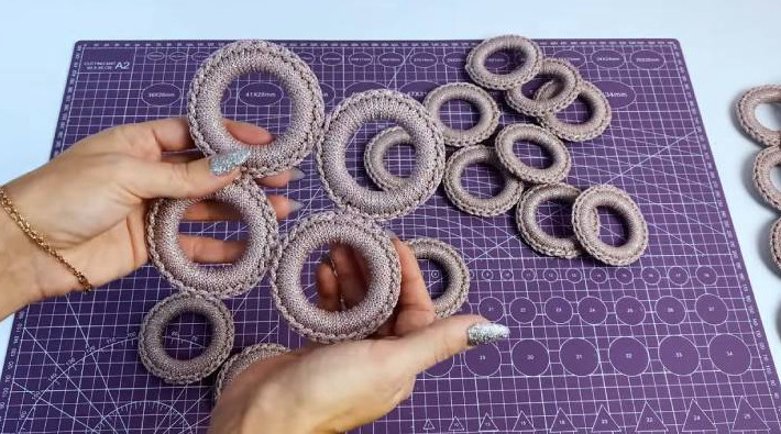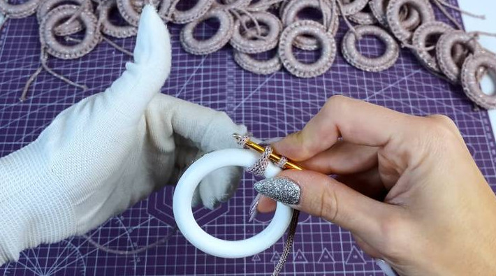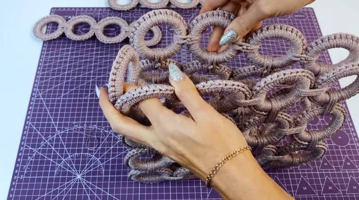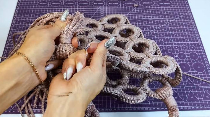 Наконец, сшитые и декорированные детали из колец соберите воедино. Сшивать нужно также вручную и декорировать шнуром.