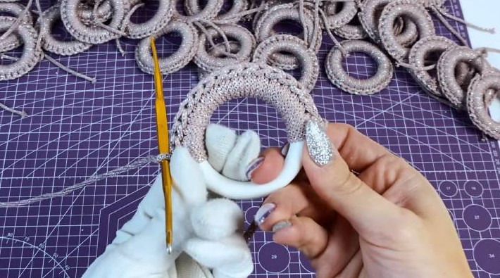 Дополнительно детали декорируйте отрезом шнура примерно 37 см. Сразу определите, где будет изнаночная сторона колец, и там прячьте узелки.