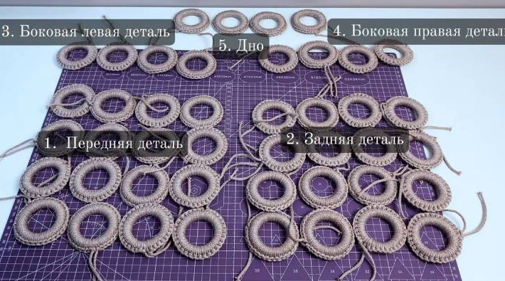 Итак, обвяжите 44 кольца способом, указанным выше. Из них 32 уйдут на переднюю и заднюю детали (по 16 шт. каждая), а оставшиеся 12 — на боковые детали и дно (по 4 шт. каждая). Более наглядно можно увидеть на фото ниже: