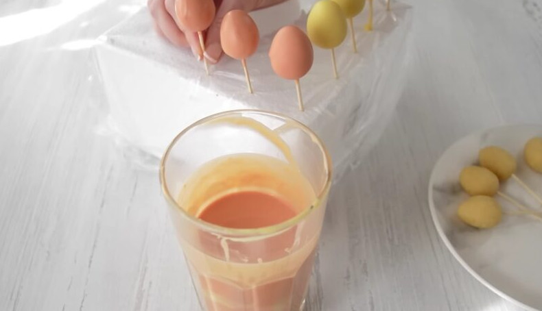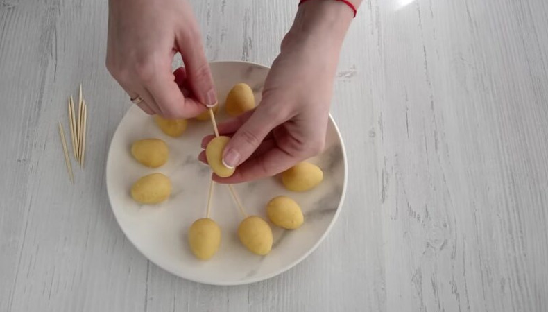 Для приготовления маленьких декоративных яиц потребует по 10 грамм бисквитной массы. Сформуйте заготовки, по форме напоминающие яйца. Воткните в заготовки зубочистки и поместите их в холодильник на час.