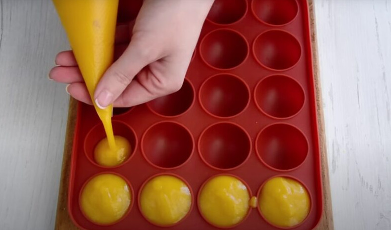 Большие пирожные можно приготовить с начинкой, которая будет имитировать желток настоящего яйца. Для приготовления начинки заморозьте пюре манго в небольших полусферах (если пюре жидкое, к нему можно добавить небольшое количество крахмала).