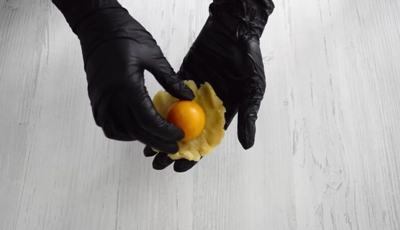 60 грамм бисквитной массы разомните в руках и превратите в лепешку. Внутрь лепешки поместите начинку. Накройте начинку бисквитной массой и сформуйте большое яйцо. Воткните в пирожные деревянные шпажки и уберите их в холодильник.