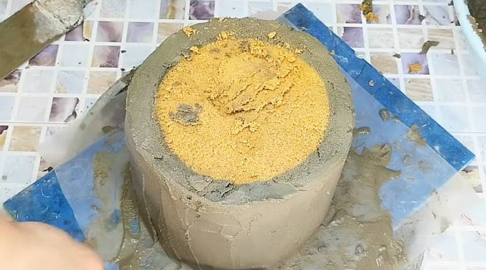 Цементно-песчаный раствор разведите водой, чтобы он стал жиже. Вылейте на песок. Разровняйте удобным инструментом. Жидкий раствор очень быстро схватывается. А потому через короткое время можно добавить полноценный слой (1 см) уже густого цементно-песчаного раствора. Сразу срежьте верхушку. Форма под горшок готова! Оставьте на 2 часа.
