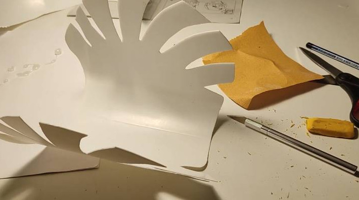 Нарисуйте и вырежьте из бутылки листья. За основу можно взять лист монстеры (тропическое растение). Края зачистите мелкозернистой наждачной бумагой. При необходимости пластик можно покрасить. Вот как это будет выглядеть в итоге:
