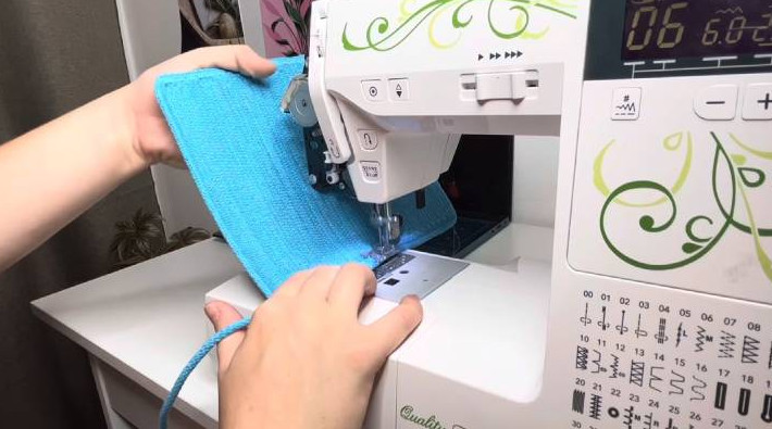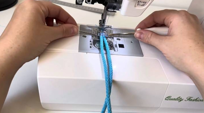 Форма может быть любой, в том числе круглой и квадратной. Возьмите шнур 5 мм. Отмерьте ширину, которая будет для вас удобна (в МК — 18 см). Загните шнур и, помогая себе инструментами, сшейте на машинке зигзагом.