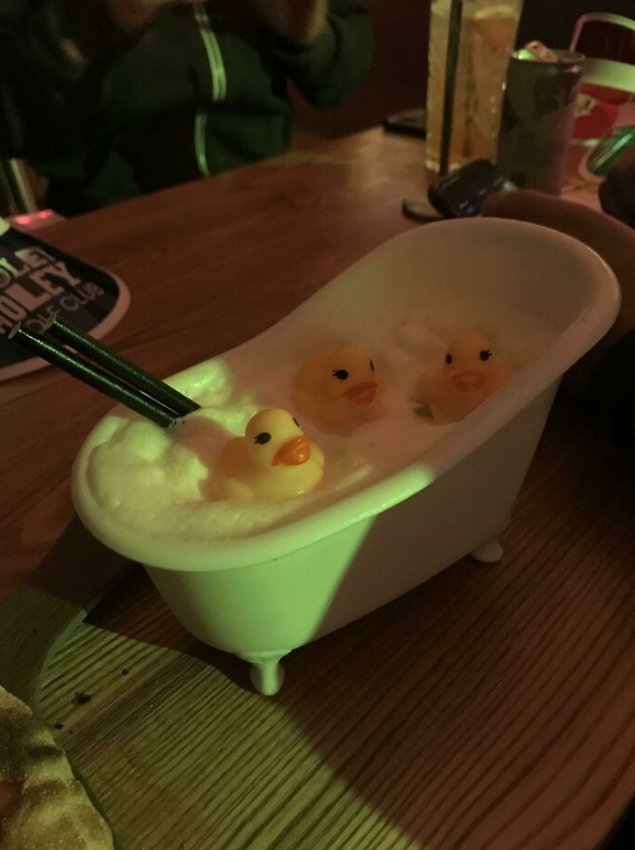 Это блюдо самое милой в сегодняшней подборке. После того, как выпьешь такой коктейль, можно попросить забрать уточек домой.