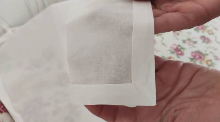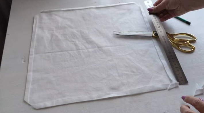 Вырежьте из простыни квадрат. Размер опционален и зависит исключительно от ваших предпочтений. Подверните край на 1 см, проутюжьте. Отмерьте 3 см по углам, вырежьте треугольники.