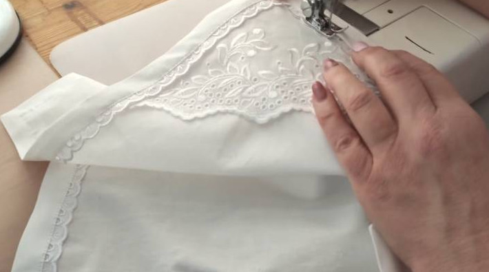 Вставьте кружево по желанию, чтобы декорировать изделие. Проложите отделочную строчку на машинке.