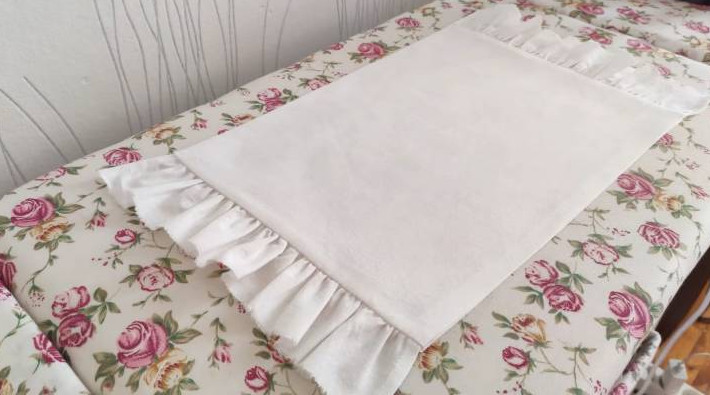 Параллельно с этим вырежьте прямоугольник из простыни. Сверните вдвое. Отдельно оторвите 2 полосы, уберите нитки, соберите как рюшу. Вставьте рюши по бокам согнутого прямоугольника. Проутюжьте, сшейте всё вместе.