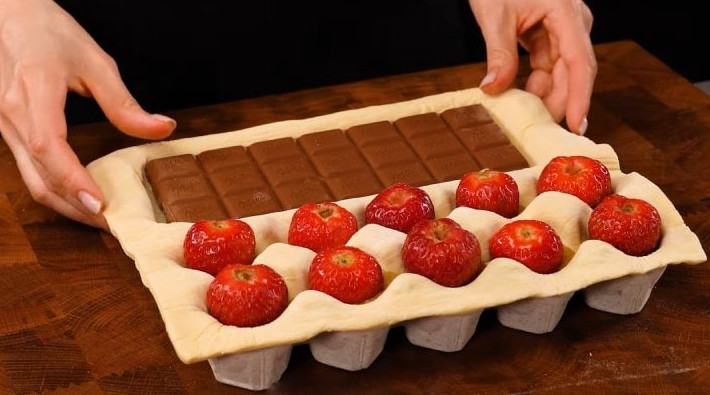 Обалденная вкуснятина к чаю за считанные минуты! Даже тесто готовить не надо — возьмите пачку из магазина, а также шоколадку и любимые ягоды. Отличный вариант быстрой выпечки для самых занятых. Вкусный и простой десерт-находка! Appetizing.tv-Baking Recipes/youtube Ингредиенты: слоёное тесто — 700 г; варенье по выбору; клубника — 10 шт.; шоколад — 100 г; яйцо — 1 шт. Десерт из слоёного теста Возьмите пластиковую форму из-под яиц, тщательно промойте с мылом и высушите. Сверху уложите слоёное тесто, утрамбуйте в ячейки. Наполните ячейки с тестом чем угодно. В данном случае используется самодельное яблочное пюре свежая клубника. На противоположную сторону положите плитку шоколада (молочного или горького, какой любите). Appetizing.tv-Baking Recipes/youtube Взбейте яйцо, смажьте края. Склейте 2 половинки теста. Переложите на противень, выстеленный пергаментной бумагой. Смажьте взбитым яйцом сверху. Appetizing.tv-Baking Recipes/youtube Отправьте в духовку. Выставите 180 градусов, запекайте 25 минут. Appetizing.tv-Baking Recipes/youtube При подаче можно присыпать сверху сахарной пудрой. Получается быстрый сладкий пирог, который легко разделить на порционные кусочки!