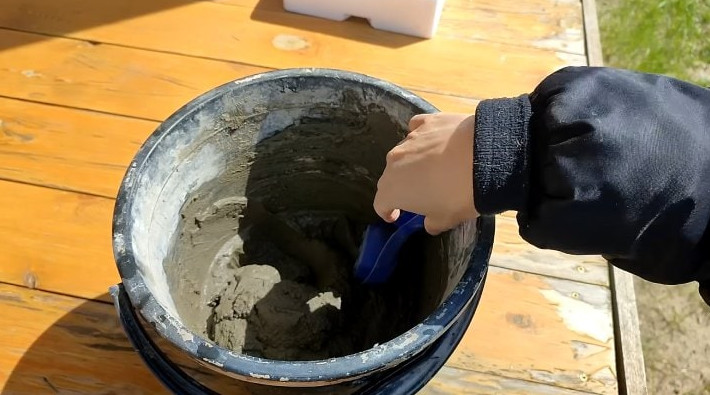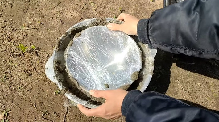 Погрузите миску в раствор в казане. Добавьте раствор, если есть пустоты.