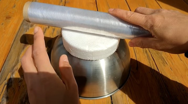 Возьмите миску, зафиксируйте на дне снаружи кусок пенопласта. Оберните плёнкой.