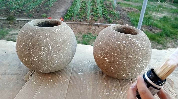 Через сутки-двое прогрунтуйте кашпо. Затем, по прошествии нескольких часов, наденьте перчатки и с помощью кисточки разбрызгайте капли чёрной и белой краски.