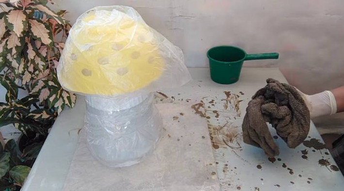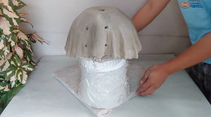 Подготовьте плотную ткань (квадрат). Всыпьте в миску стакан цемента, влейте воду, чтобы получился жидкий раствор. Пропитайте ткань. Соберите конструкцию, на которой тряпка будет высыхать и приобретать необходимую форму. Для этого на пластиковое ведро или вазу поставьте миску дном вверх. Закройте всё одноразовыми пластиковыми пакетами или плёнкой.