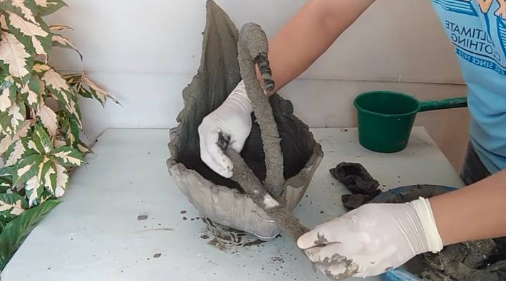 Вставьте несколько кусков проволоки в ранее проделанные отверстия сбоку. Закрепите шею, перекрутив концы проволоки между собой. Сгладьте неровности, добавив ещё кусок тряпки, смоченной в цементе. Покройте поделку ещё одним слоем раствора, но уже более густого. Оставьте до полного высыхания на 2-3 дня.