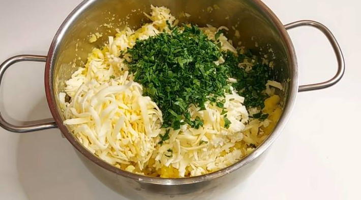 Сварите картофель, сделайте пюре. Посолите, добавьте натёртый сыр и мелко порезанную зелень.