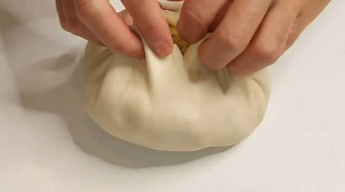 Разделите тесто на 4 части. Каждую раскатайте в пласт. Положите по шарику начинки, защипните края, переверните.
