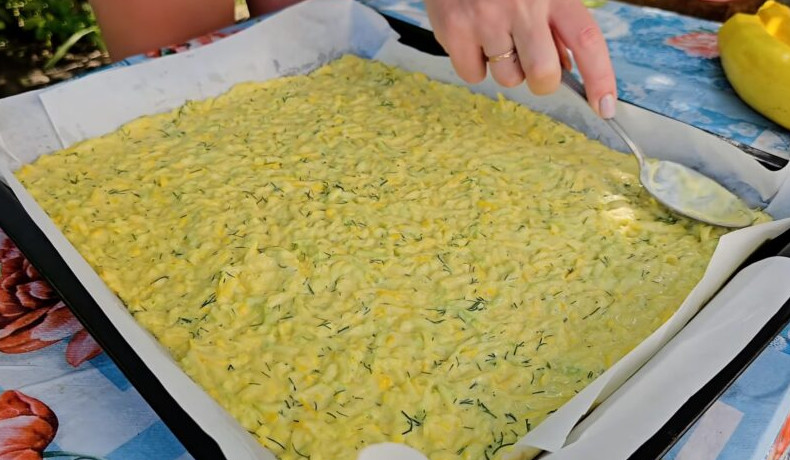 Выложите кабачковое тесто на противень, выстеленный пергаментной бумагой и распределите слоем около 1 см. Выпекайте кабачковый корж в духовом шкафу, предварительно разогретом до 180 градусов, в течение 20-25 минут.