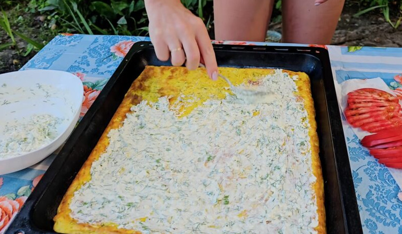 Смажьте остывший корж подготовленной намазкой, сверху выложите помидоры. Вместо помидоров можно использовать грибы, куриную грудку, ветчину и другие ингредиенты по вашему вкусу.