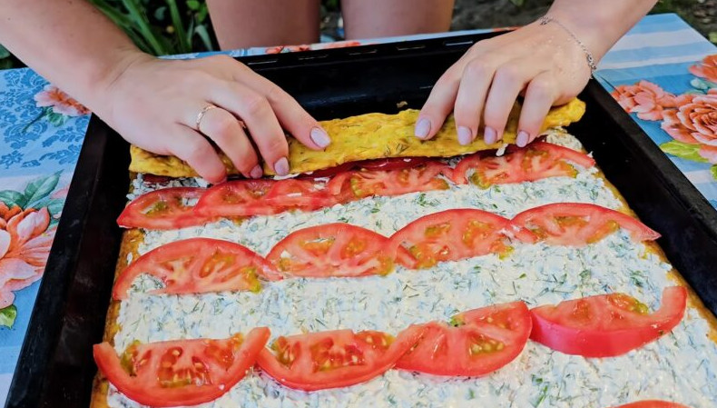 Летнее меню невозможно представить без блюд из кабачков. Прекрасной альтернативой кабачковым оладьям станет кабачковый рулет с начинкой. Готовится рулет очень просто и быстро, получается невероятно вкусным и красивым — его можно подавать даже на праздничный стол! Кабачковый рулет может выступить в качестве полноценного блюда для легкого обеда или как чудесная закуска к мясным блюдам. Кухня Evelin/youtube Необходимые ингредиенты Кабачковый рулет: кабачки — 600-700 гр; яйца — 3 шт; мука — 3-4 ст.л; сметана — 2 ст.л; майонез — 1 ст.л; укроп — 30 гр; соль — 1 ч.л; смесь перцев — 0.3 ч.л; твердый сыр — 80 гр (по желанию). Начинка: плавленные сырки — 2-3 шт (или творожный сыр/твердый сыр); укроп/петрушка — 40 гр; помидоры — 2 шт; сметана/майонез- 3 ст л; чеснок — 2 зубчика. Процесс приготовления Натрите кабачки на крупной терке. К натертым кабачкам добавьте чайную ложку соли, хорошо перемешайте и оставьте на 10 минут, чтобы кабачки пустили сок. В отдельной емкости соедините яйца, сметану, майонез, соль и перец. После того как кабачки пустят сок, хорошо отожмите их (это необходимо для того, чтобы рулет был упругим), и соедините с яичной смесью. Кухня Evelin/youtube Добавьте зелень, муку и тщательно перемешайте все ингредиенты. По желанию к кабачковому тесту можно добавить немного твердого сыра, так рулет будет еще вкуснее. Выложите кабачковое тесто на противень, выстеленный пергаментной бумагой и распределите слоем около 1 см. Выпекайте кабачковый корж в духовом шкафу, предварительно разогретом до 180 градусов, в течение 20-25 минут. Кухня Evelin/youtube Для приготовления начинки соедините натертые плавленые сырки, зелень, измельченный чеснок, сметану или майонез. Сборка рулета Смажьте остывший корж подготовленной намазкой, сверху выложите помидоры. Вместо помидоров можно использовать грибы, куриную грудку, ветчину и другие ингредиенты по вашему вкусу. Кухня Evelin/youtube Сформуйте плотный рулет: корж очень упругий, работать с ним легко. Кухня Evelin/youtube Заверните рулет в пищевую пленку и отправьте в холодильник на пару часов. За это время кабачковый корж хорошо пропитается и рулет можно будет подавать к столу. Кухня Evelin/youtube