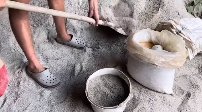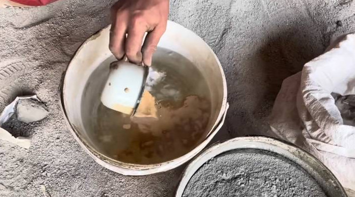 В ведро налейте 7 л воды. Бросьте щепотку фиброволокна + 100 г пластификатора (по инструкции).