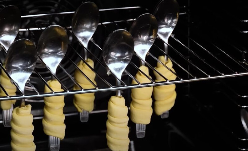Нарежьте слоеное тесто на полосы шириной 1,5 см. Каждую полосу теста накрутите на 2, сложенные вместе, столовые ложки.