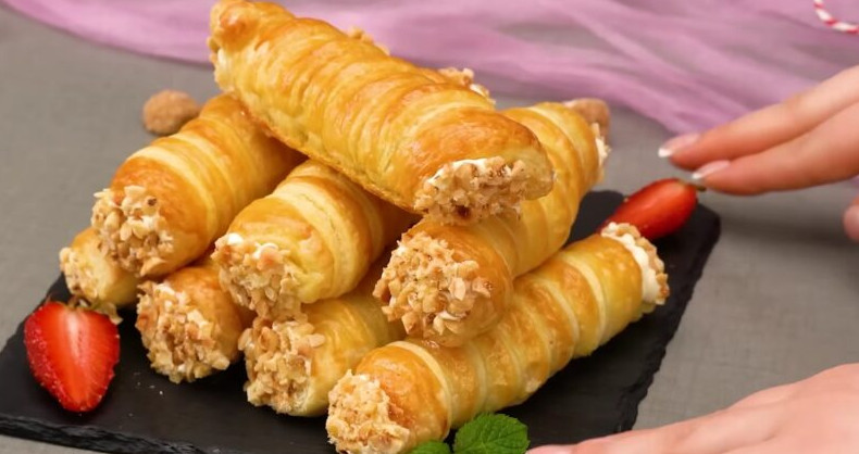 У каждой хозяйки в холодильнике обязательно должна быть пачка слоеного теста, ведь это настоящая палочка-выручалочка. Используя слоеное тесто, можно легко приготовить вкусный десерт, который соберет за столом всю семью. Appetizing.tv-Baking Recipes/youtube Необходимые ингредиенты: слоеное тесто: 400 г; порошок для пудинга со вкусом ванили: 45 г; сахар: 50 г; молоко: 400 мл; сливки для взбивания: 300 мл; фундук: 100 г. Процесс приготовления Нарежьте слоеное тесто на полосы шириной 1,5 см. Каждую полосу теста накрутите на 2, сложенные вместе, столовые ложки. Appetizing.tv-Baking Recipes/youtube Разместите заготовки на решетке от духового шкафа. Выпекайте трубочки при температуре 180 градусов в течение 20 минут. Appetizing.tv-Baking Recipes/youtube Для приготовления крема соедините порошок для пудинга, сахар и молоко. Тщательно перемешайте ингредиенты и проварите массу до загустения. Накройте пудинг пищевой пленкой «в контакт» и охладите в течение 30 минут. К остывшему пудингу добавьте жирные сливки и взбейте ингредиенты до получения пышной массы. Appetizing.tv-Baking Recipes/youtube Переложите крем в кондитерский мешок и наполните им остывшие трубочки. Appetizing.tv-Baking Recipes/youtube Кончики трубочки по желанию можно оформить молотым орехом. Остается только подать десерт к столу. Appetizing.tv-Baking Recipes/youtube