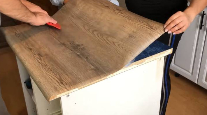 Старую столешницу тоже можно обновить на бюджете! Для этого обезжирьте её. Для преображения вам понадобится самоклеящаяся плёнка. Отрежьте необходимый кусок и приклейте, медленно разглаживая!