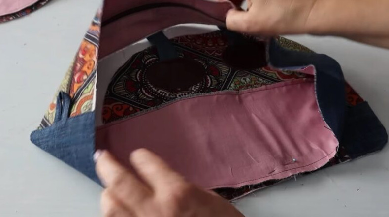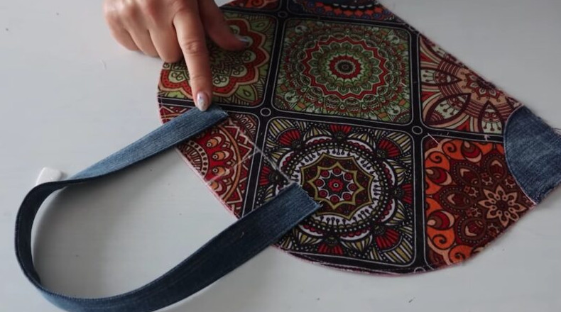 Из подкладочной и джинсовой ткани выкроите детали для изготовления верхней части сумки.