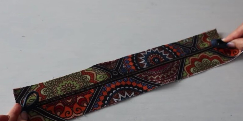 Поместите деталь с молнией между двумя заготовками и проложите фиксирующие строчки. В результате получится средняя часть сумки.