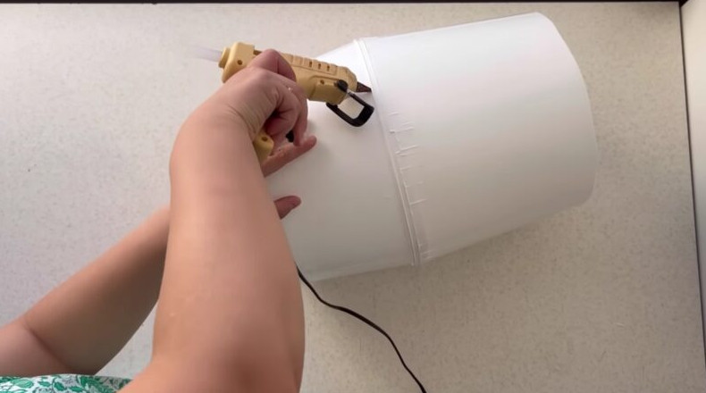 Срежьте выступающие бортики пластиковых ведерок. У одного из ведер срежьте дно. Разместите ведра друг на друге и соедините их с помощью горячего клея. В итоге получится основание высокой корзины.