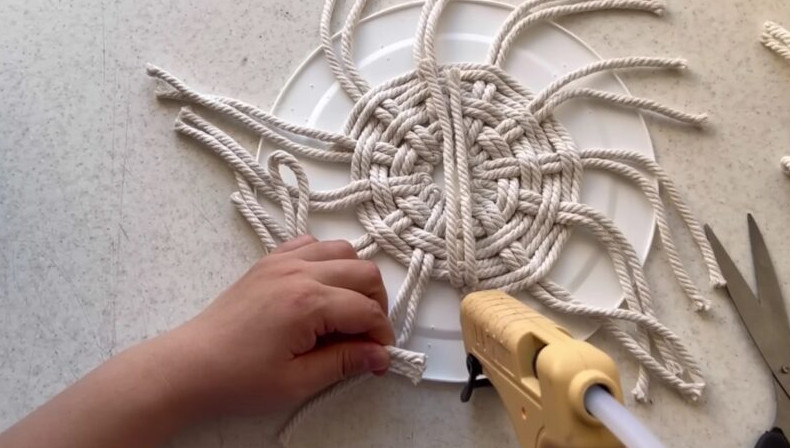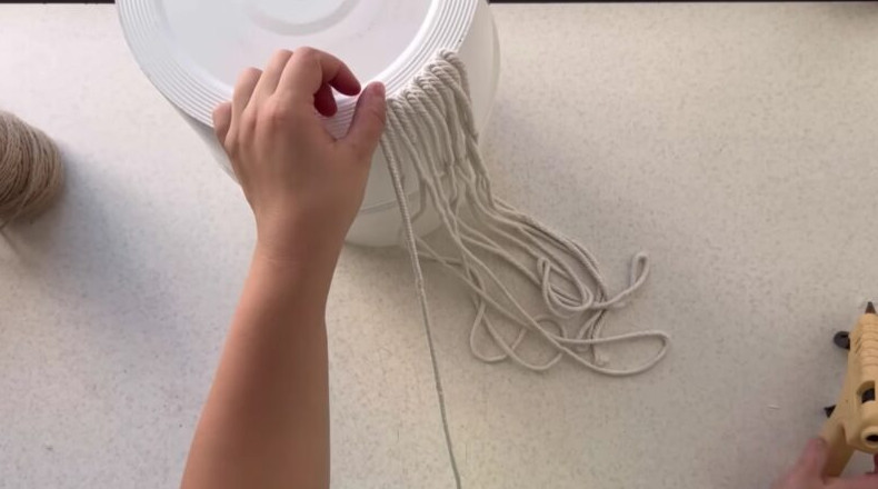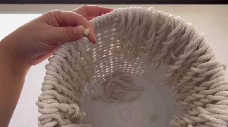 Свободные концы шнура обрежьте и зафиксируйте внутри корзины с помощью горячего клея.