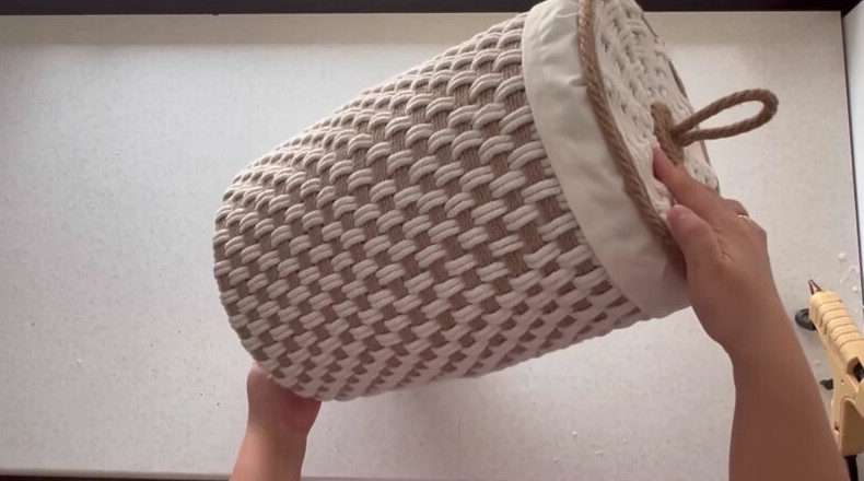 Для изготовления ручки сделайте петельку из самого толстого шнура. Зафиксируйте петельку в центре крышки. Нижнюю часть крышки задекорируйте тонкой тканью. Чтобы крышка выглядела еще более аккуратно, приклейте к ободку толстый шнур. Для оформления внутренней части корзины подготовьте чехол подходящего размера. Разместите чехол внутри корзины.