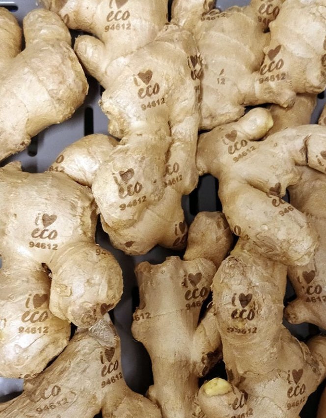 Продуктовый магазин печатает этикетку прямо на имбире с помощью пищевых чернил, чтобы исключить необходимость в упаковке или этикетках
